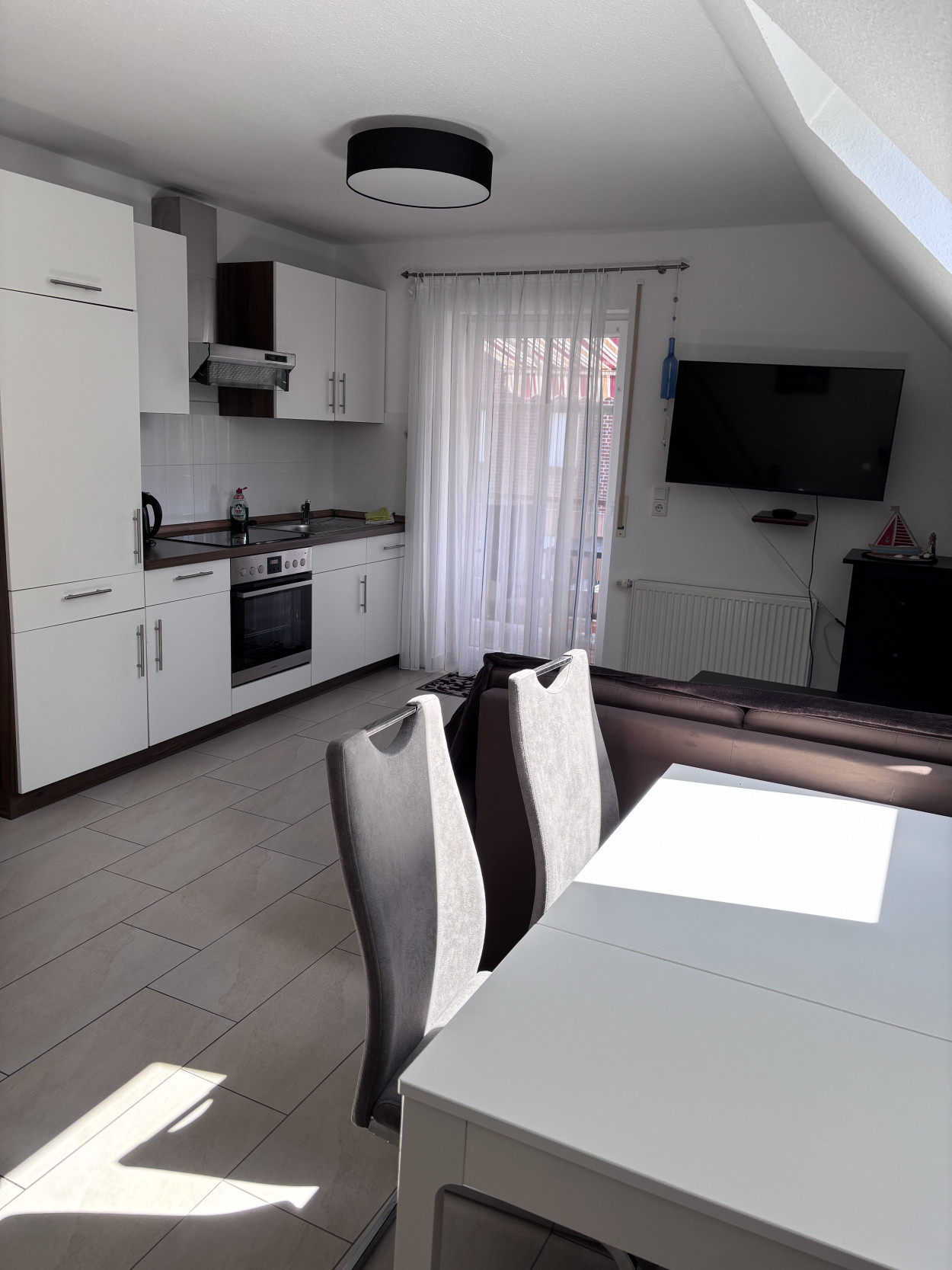 Die Wohnung bietet Ihnen ein großzügiges Wohnzimmer mit integrieter Einbauküche, wo Sie nach Herzenslust kochen können. Ausgestattet ist die Küche mit einem Backofen, E-Herd, Kühlschrank, Spülmaschine sowie Besteck und Geschirr.