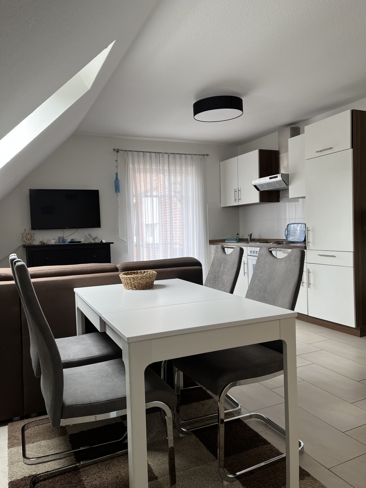 Die Wohnung bietet Ihnen ein helles Wohnzimmer mit integrieter Einbauküche. Die Küche ist Ausgestattet mit einem Backofen, E-Herd, Kühlschrank sowie Besteck und Geschirr.